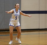 The Eagles’ Janessa Knudsen (5) gets set on defense as Cascade Christian Academy advances the …