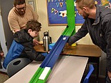Ten-year-old Levi Roark learns about potential and kinetic energy by rolling a metal ball through …