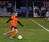 Tigers freshman Midfielder Sophie Molitor moves the ball down field and prepares to kick the …