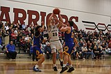 MLCA/CCS’s Max Gulenko makes an attempt at the basket under pressure from the ACH Warriors …