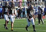 The Huskies Gavin Carl (5) runs down the sideline on his way to the end …