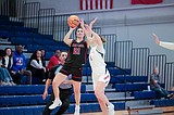 The Eagles’ Janessa Knudsen (5) gets set on defense as Cascade Christian Academy advances the …