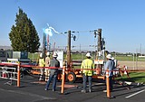 Grant PUD workers demonstrate what happens to a kite caught in power wires at Quincy’s …