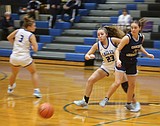 Moses Lake senior Addyson Burns pushes toward the hoop for a layup with pressure from …