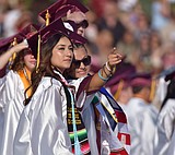 Several 2025 Moses Lake High School graduates point and look for their parents and friends …