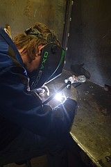 Roenin Matosich works on welding two pieces of metal together. Matosich is one of the …