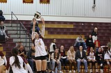 Moses Lake junior Kaelsey Wiltbank (9) sets the ball in the first set against Davis. …