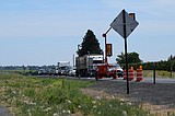 Traffic waits for the portable traffic light at the new roundabout at White Trail Road …