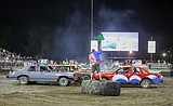 Flagman Brandon Douglass waves the green flag to signal the start of the demolition derby …