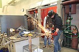 Kaine Geddes cuts apart metal springs that will become part of a fishing pole sculpture.