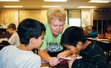 Kaye Ward shows third graders Fidel Rodriguez (left) and Osiel Mora how to look up …
