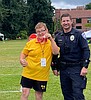 Brandon Svopa stands with an officer and holds up his bronze medal after the bocce …