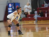 The Wahluke Warriors’ Kathy Veloz (10) awaits the Knights next serve. Head Coach Monica Cortez …