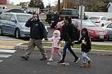 Parents and children cross the Scootney Springs Elementary parking lot on the first day of …