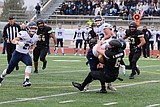 A Quincy running back runs behind a wall of offensive linemen against the Connell defense.