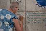 A cancer patient adds a message of encouragement to the walls of the Radiation Oncology …