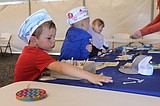 A fish-hatted Archaeology Days visitor reaches for the parts to build a skeleton. The event …