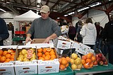 Mark Rowley of Rowley & Hawkins Fruit Farms adds to the displays at his stand …