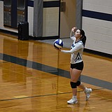 Sage Hart, a senior for the Eagles, gets ready to serve during a road game …