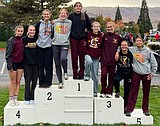 The Moses Lake girls cross country team takes a team photo on the podium at …
