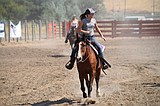 Addie Harold, 13, of Ritzville, works her horse in the Ritzville Rodeo arena on the …