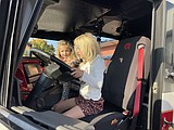 Mabel Hickok, 4, and her sister Sloane, 6, sit at the wheel of a Moses …