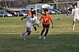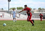 An East Valley player and Ephrata High School junior Diego Garcia (5) eye the ball …