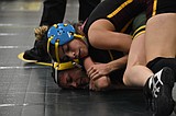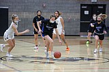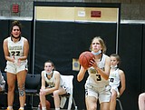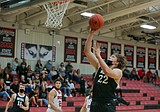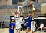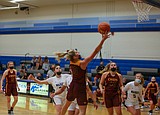 Moses Lake High School's Anna Olson soars into the lane for a layup in the …