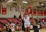 Royal High School's Avery Ellis goes up for a basket early in the first half …