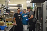 Three food services employees, Sidney Clark, Samantha Lopez and Maria Osorio work to prepare lunch …