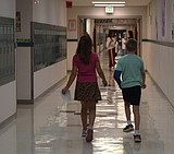Two sixth grade students walk down the Columbia Middle School hallway on the first day …