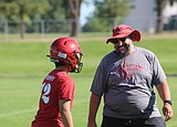 Broncos Head Coach Brendan Bermea talking with one of his players during their first practice. …
