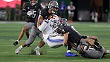 Cougars Anthony Palano (0) and Caleb Francl (9) combine for a tackle against Colorado State …