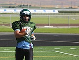 Warriors running back Juan Valdovinos, right, gets set for a drill during practice. Head Coach …