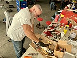Kaine Geddes cuts apart metal springs that will become part of a fishing pole sculpture.
