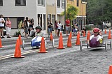 BMX riders race down the ramp after the first turn at the Moses Lake BMX …