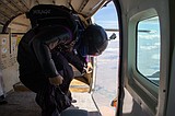 The last wingsuiter left in the plane lowers his head as he leaps out behind …