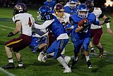 Casey McCarthy/Columbia Basin Herald Cael Cox rushes behind a blocker amidst a pile of players …
