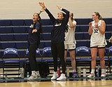 Kaliyah Evans, left, and Emily Dana, right, celebrate after their teammate made a shot against …