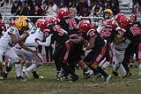 Gavin Carl pushes against a tackle dummy during the Huskies afternoon practice. The senior said …