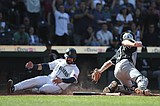 Seattle Mariners' Eugenio Suárez, left, beats a tag by Chicago White Sox catcher Kyle Teel, …