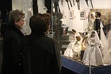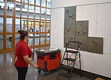 Gallery Coordinator Veronica Talbot hangs the nine plates of a fresco showing the life of …