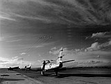 Four F-86 fighter jets, likely with the 71st Fighter Squadron, fly over a pair of …