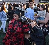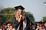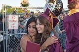 A new Royal High School graduate smiles at friends and family after the commencement ceremony …