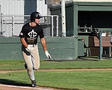 The Sixers’ Carson Valdez tips his helmet to the dugout as he rounds third base …