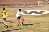 A Wahluke Boys Soccer player dribbles the ball during practice in front of a large …