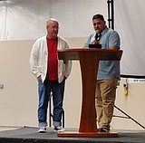 Former state Rep. Gary Chandler, left, presents Tom and Dayna Dent with a plaque commemorating …
