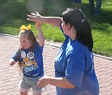 Five-year-old Cheyenne Aubart dances with family friend Lily Ochoa during the warmup to the Buddy …