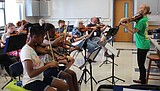 Students run through a song during a class at the Washington Old-Time Fiddlers workshop Monday …