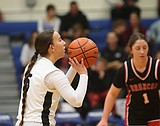 The Cougars’ Amaya Erickson (5) shoots a free throw against the Broncos on Saturday. Cougars …